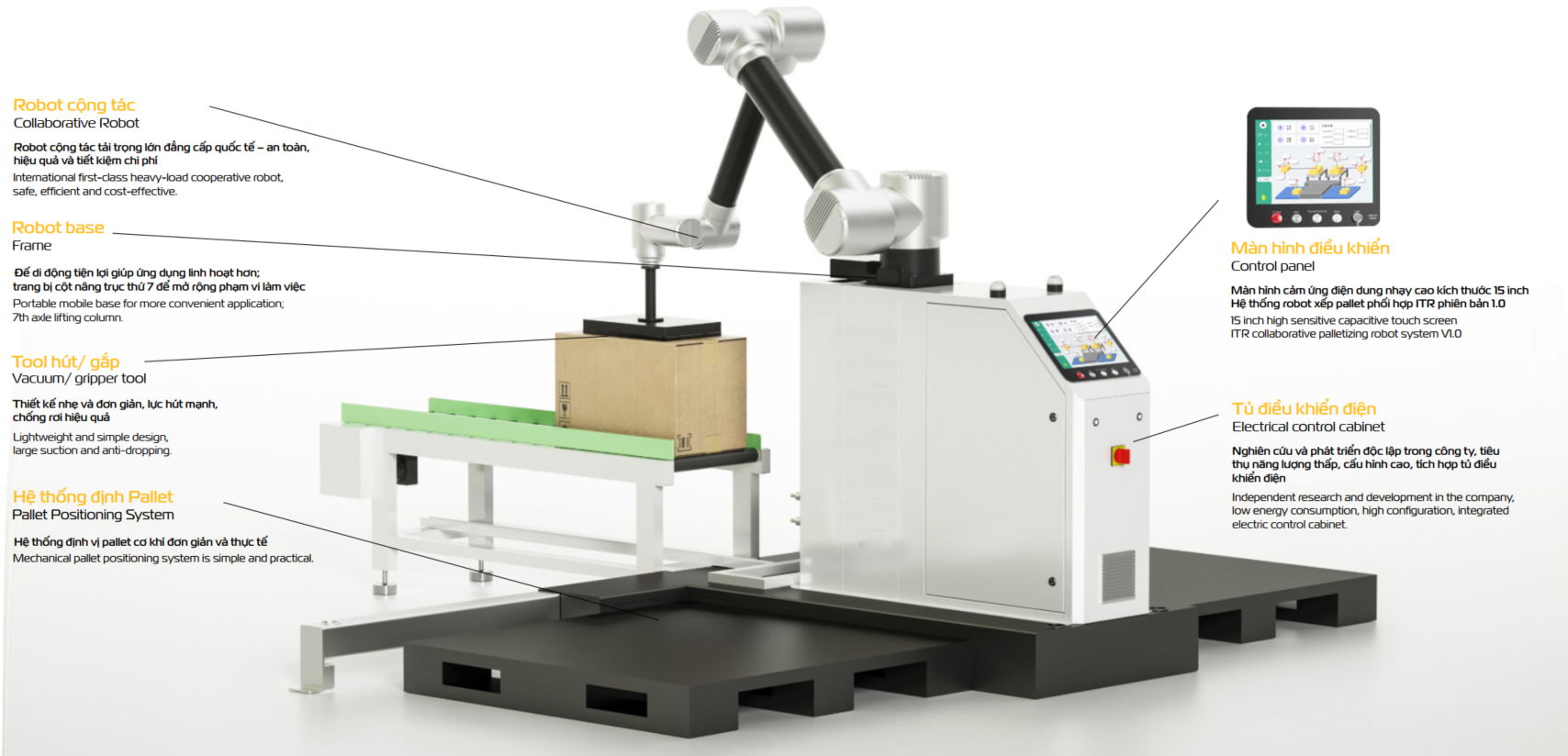 - Hỗ trợ nhiều chế độ hợp tác: Hợp tác người - máy, hợp tác hai robot, tích hợp nhiều máy, cùng hỗ trợ hợp tác giữa máy - máy và máy - máy tính. Có thể tích hợp với các dòng máy cấp pallet như: Máy quấn màng, máy dán thùng, băng tải,...